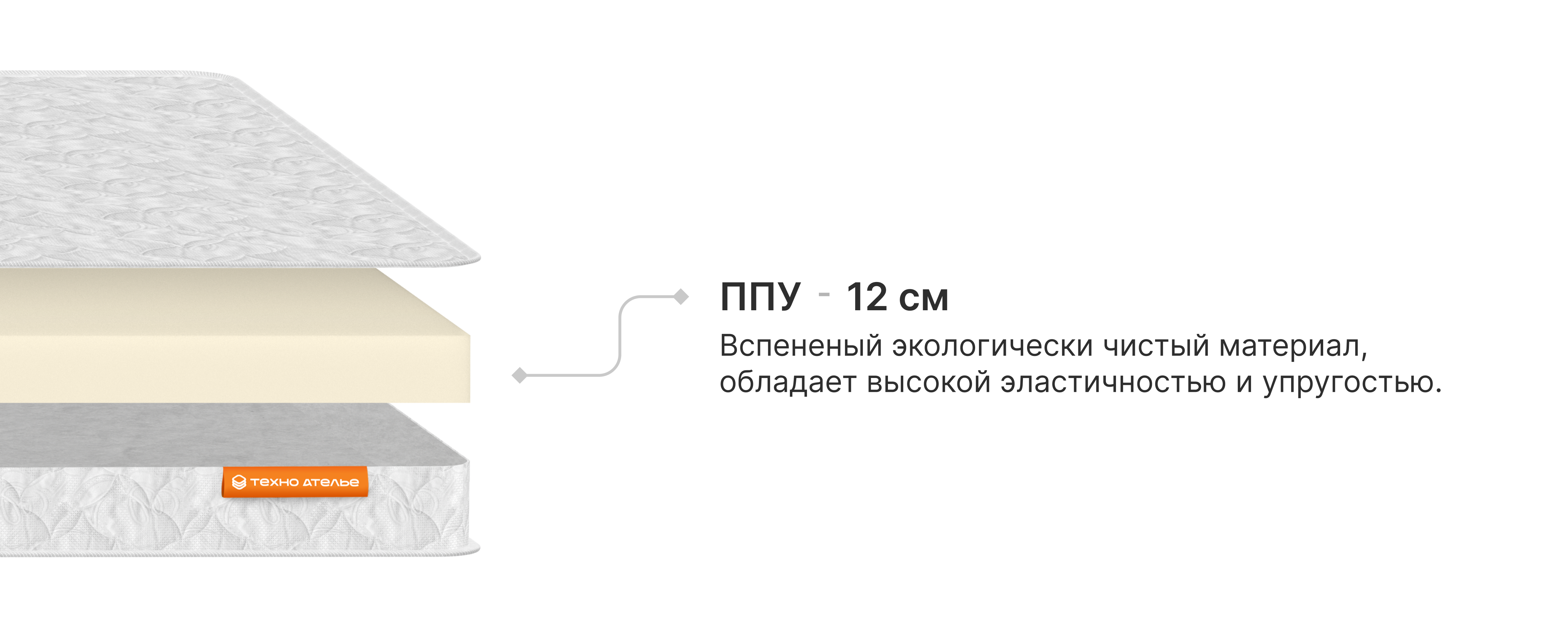 Матрас состоит из цельной плиты ППУ (пенополиуретан), который отличается повышенной плотностью и износостойкостью. Пористая структура способствует выведению влаги, пропускает воздух. Легко восстанавливается после деформации.