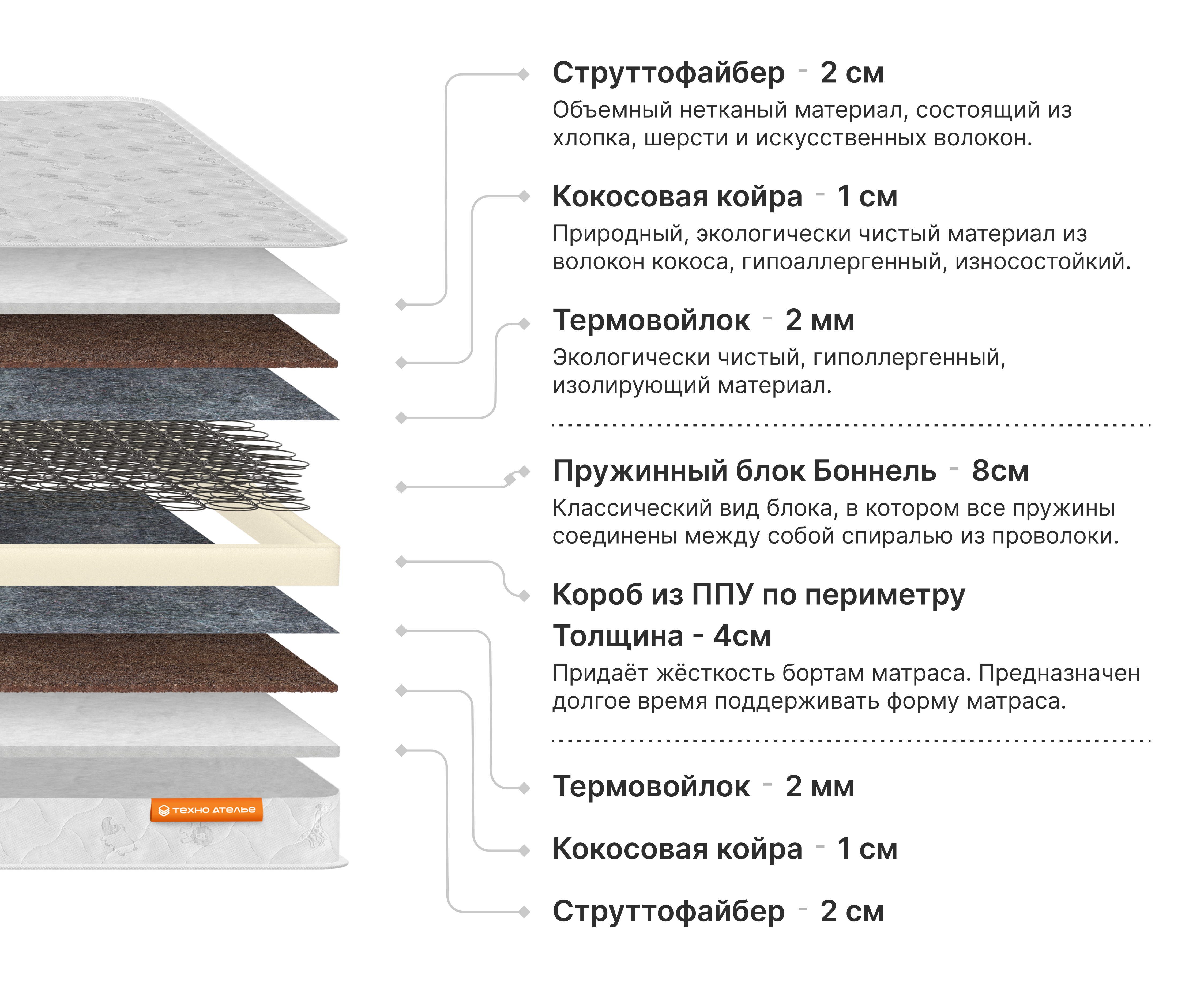 Комфортный ортопедический матрас, учитывающий особенности детского организма в процессе роста и укрепления. Пружинный блок грамотно распределяет нагрузку, а кокосовая койра позволяет воздуху циркулировать внутри матраса, продлевая срок службы.