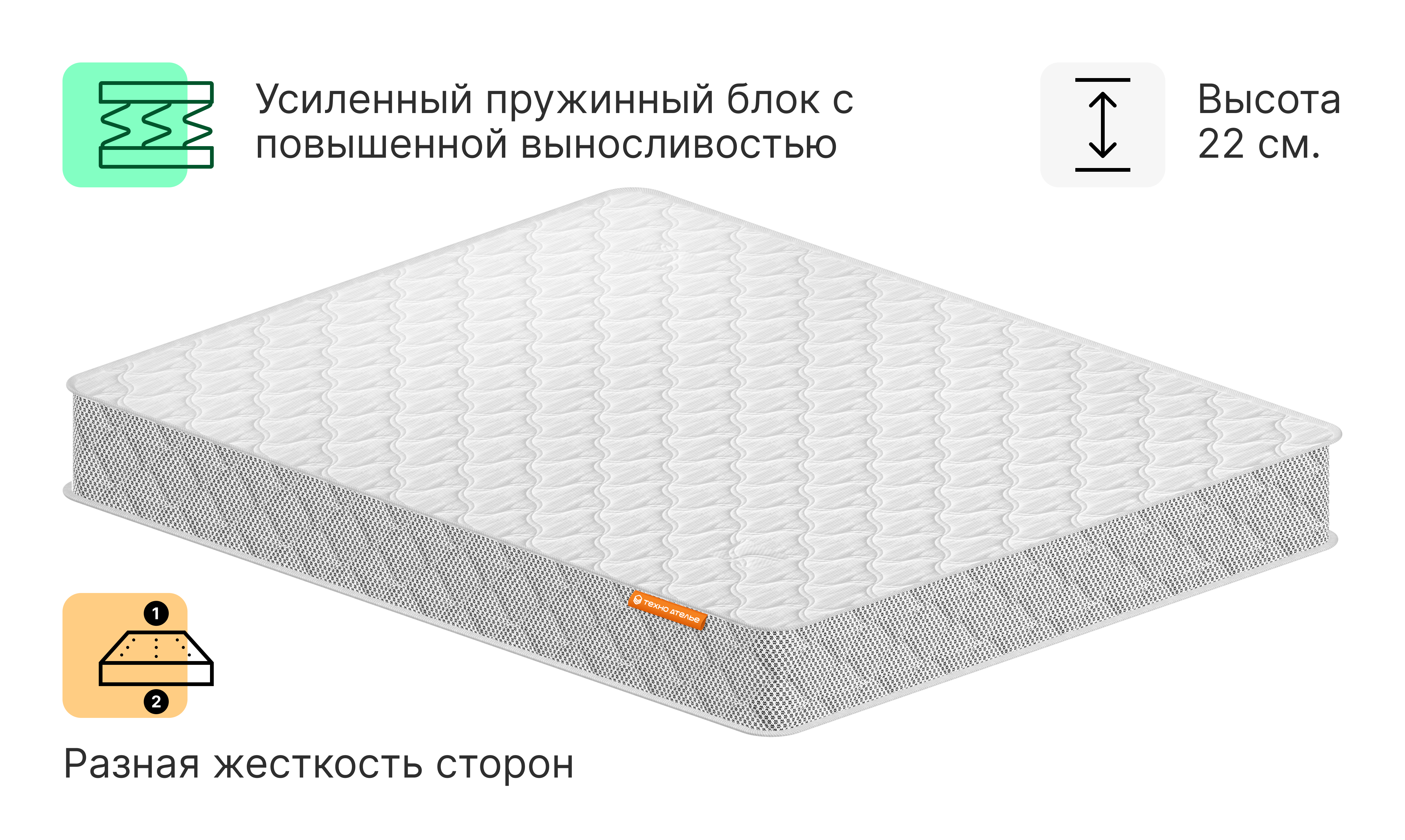 Матрас двухсторонней жесткости, как я и хотел. Высокий, пружины не проседают. По ощущениям-нормально. Чехол красивый, нареканий в общем нет. Для меня идеальный матрас. Рекомендую.