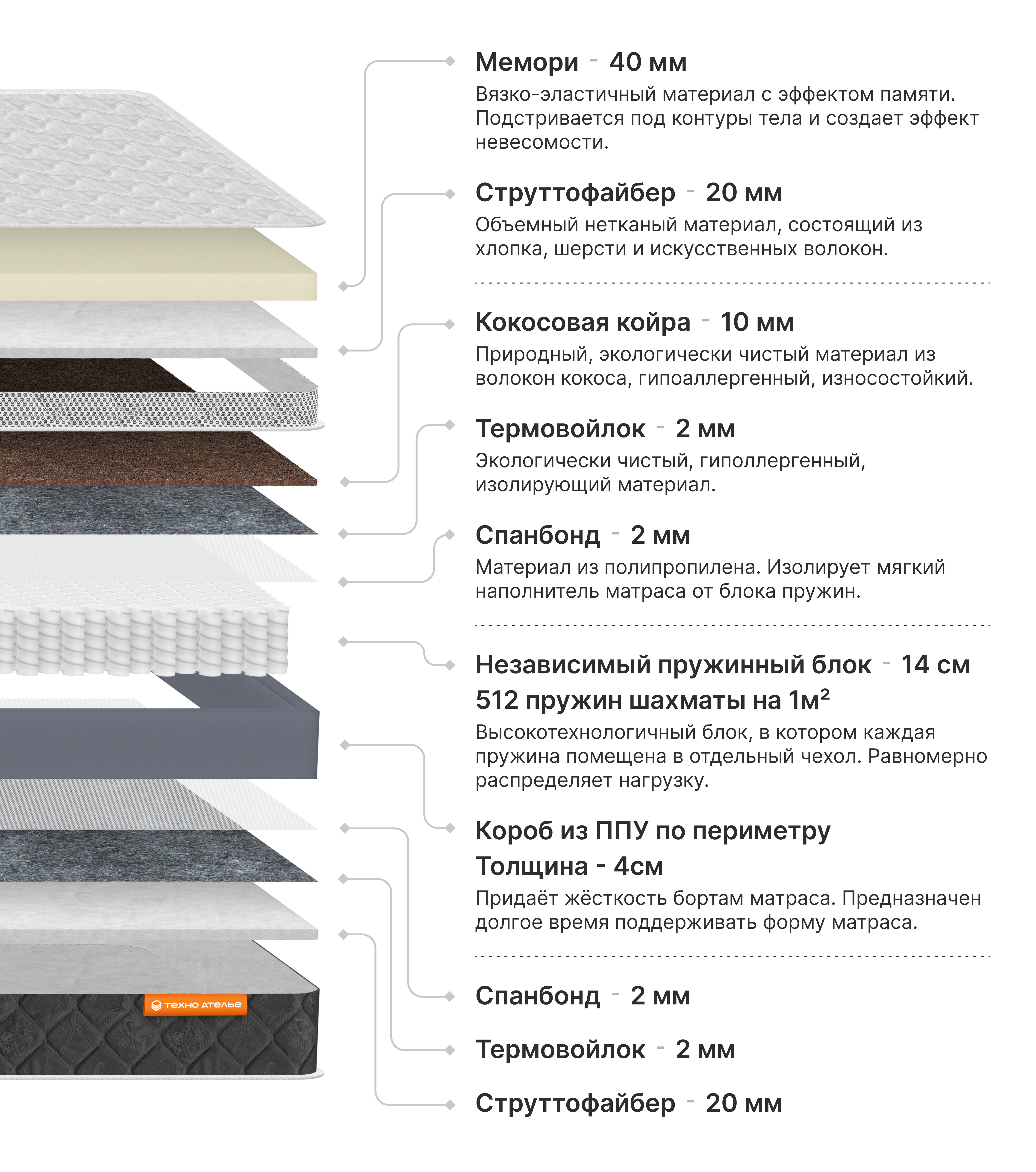 Уникальный матрас с идеальной конструкцией в безупречном исполнении. Материалы в комфортных слоях матраса и независимый пружинный блок Шахматы придают ему анатомические свойства, позволяя поддерживать позвоночник в оптимальном для здорового сна положении.
